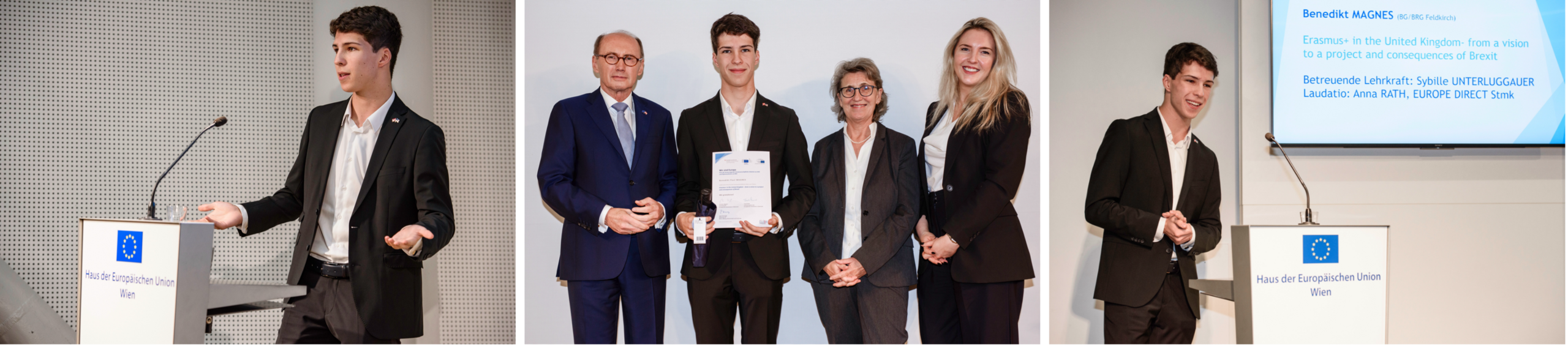 Im Rahmen der Verleihungsfeier für herausragende Abschlussarbeiten am 10. Oktober 2024 wurde Benedikt Magnes vom ehemaligen Vizepräsidenten des Europäischen Parlaments Othmar Karas geehrt. In seiner in Englisch geschriebenen Arbeit befasst sich Benedikt umfassend mit der Entstehung und Entwicklung des Erasmus+ Projektes und beleuchtet die Implikationen des Ausscheidens des Vereinigten Königreichs aus der EU sowohl aus britischer als auch aus österreichischer Perspektive. Wir gratulieren Benedikt zu dieser Auszeichnung und wünschen ihm alles Gute für seinen weiteren Weg, der ihn sehr wahrscheinlich nach Großbritannien führen wird.