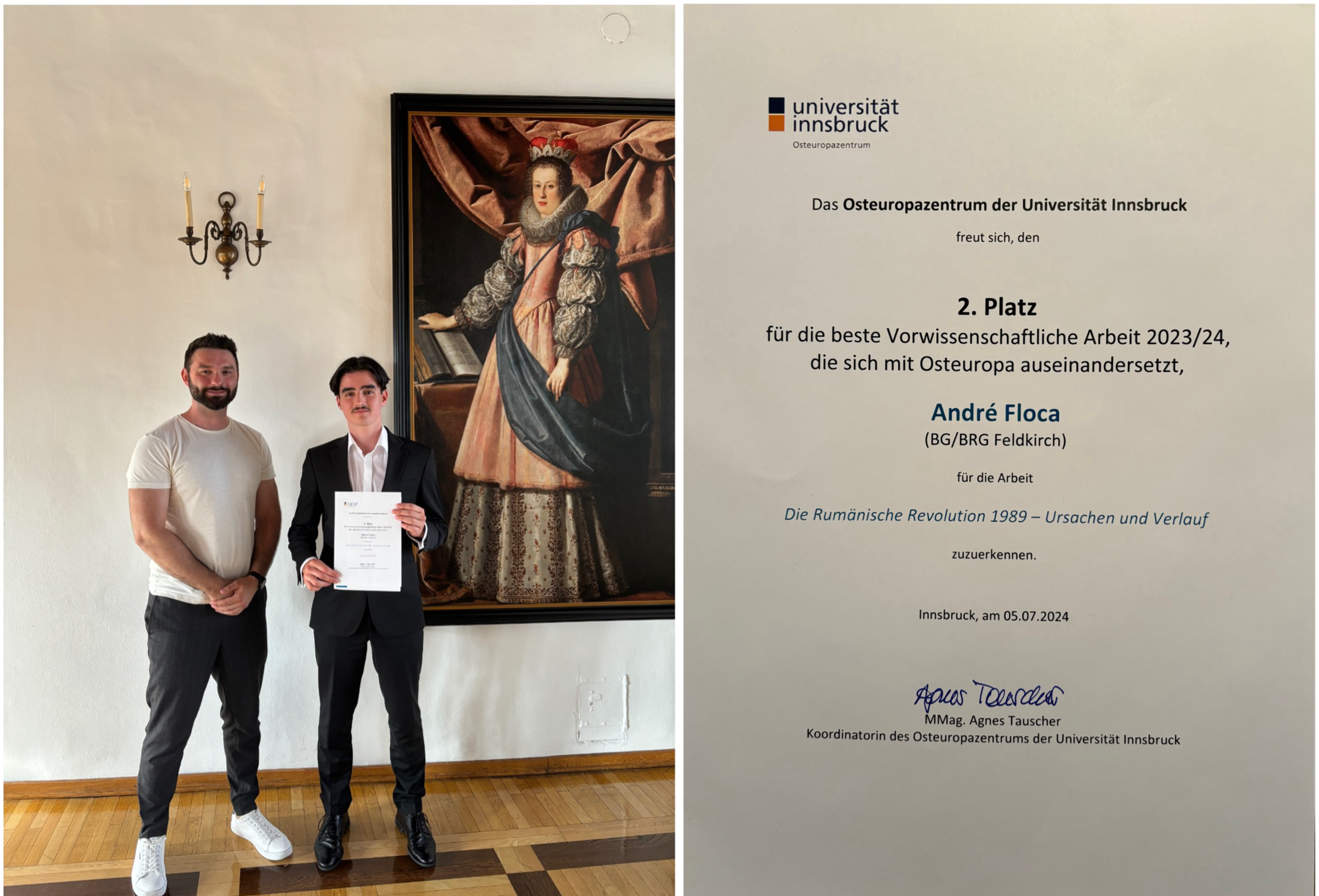 Für seine Vorwissenschaftliche Arbeit mit dem Titel "Die Rumänische Revolution 1989 - Ursachen und Verlauf" wurde André Floca mit einem Preis des Osteuropazentrums der Universität Innsbruck ausgezeichnet.